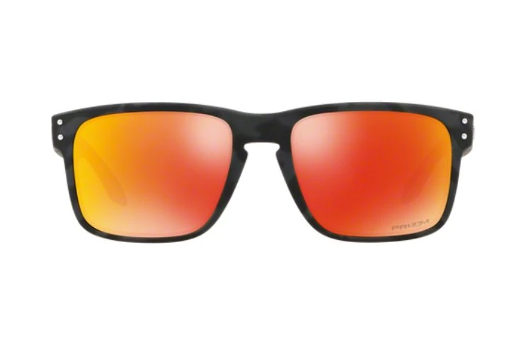 Oakley Sonnenbrille Holbrook OO 9102 E9 in Schwarz mit Camouflage-Muster und verspiegelten Gläsern in Orange – Gelb mit 100% UV-Schutz.